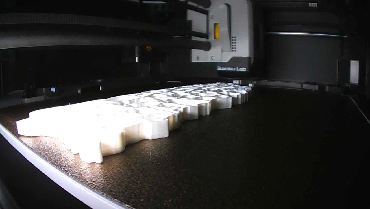 Anyway, the printing. I fired up my Bambu P1S and started with the frame. The first version had no backdrop, just the outline with cutouts for each municipality. After it finished printing, I realized the pieces would just fall right through. Back to the drawing board.